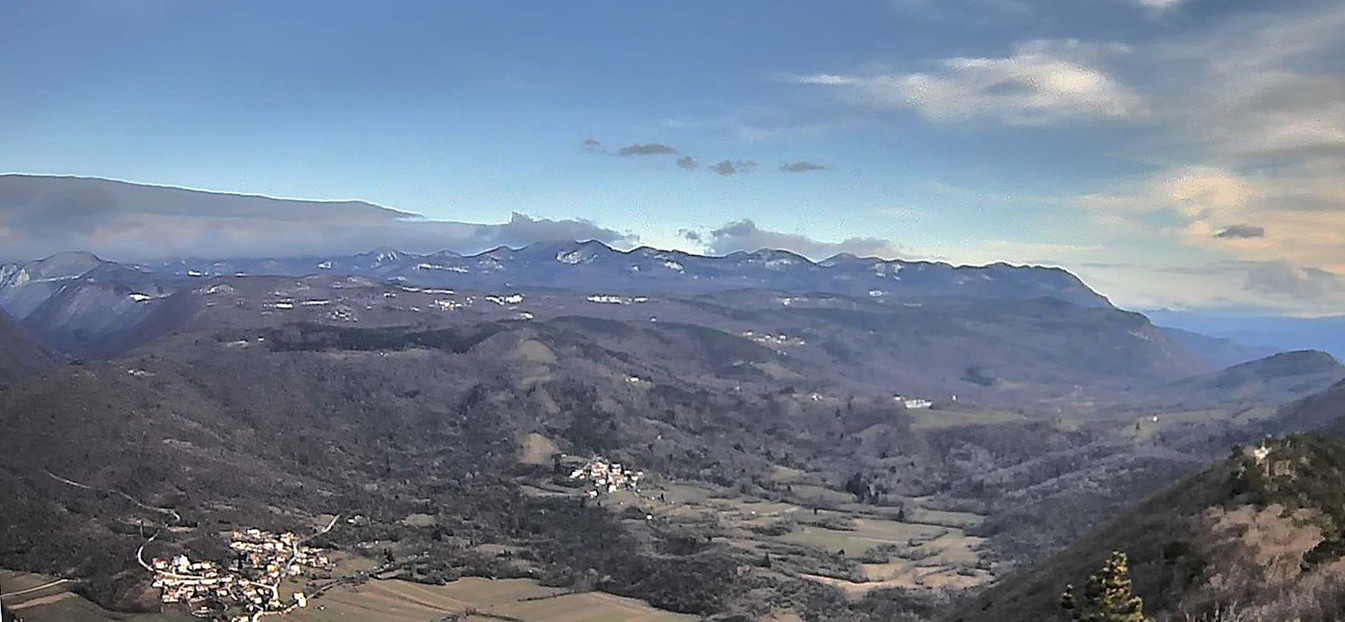veduta dal monte Santo (687 mt.) sull'altopiano della Selva di Tarnova. Neve a partire dai 900/950 metri in su.